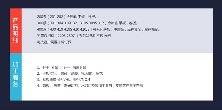 304不銹鋼平板主要用于做裝飾管,工業管,一些淺拉伸的制品.201不銹鋼板具有與不穩定的鎳鉻合金304相似的抵擋一般腐蝕的能力。201不銹鋼板在碳化鉻程度的溫度范圍中的長時間加熱可能會影響合金321不銹鋼板和347在惡劣的腐蝕介質中的。201不銹鋼板主要用于高溫應用,高溫應用要求材料有強的抗敏化性,以防止在較低溫度的粒間腐蝕。