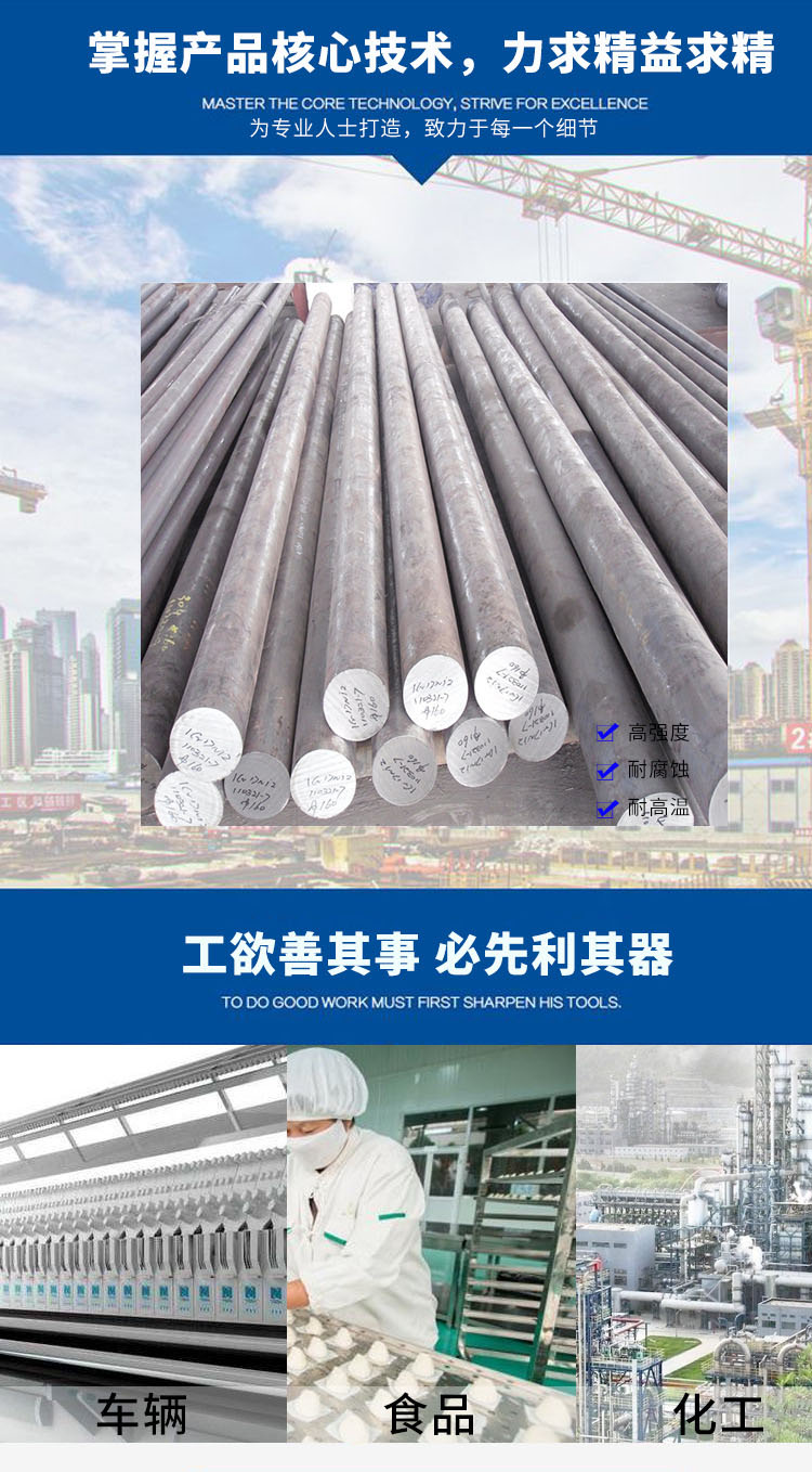 316不銹鋼棒應(yīng)用前景廣闊,被廣泛用于五金廚具、造船、石化、機(jī)械、醫(yī)藥、食品、電力、能源、建筑裝潢、核電、航空航天、軍工等行業(yè)!。海水里用設(shè)備、化學(xué)、染料、造紙、草酸、肥料等生產(chǎn)設(shè)備;食品工業(yè)、沿海地區(qū)設(shè)施、繩索、CD桿、螺栓、螺母。316不銹鋼棒按生產(chǎn)工藝分可分為熱軋、鍛制和冷拉三種。熱軋不銹鋼圓鋼的規(guī)格為5.5-250毫米。其中:5.5-25毫米的小不銹鋼圓鋼大多以直條成捆供應(yīng),常用作鋼筋、螺栓及各種機(jī)械零件;大于25毫米的不銹鋼圓鋼,主要用于制造機(jī)械零件或作無縫鋼管坯。316不銹鋼棒分為316L不銹鋼圓棒,904L不銹鋼方棒,904L不銹鋼光亮棒904L 國內(nèi)牌號00Cr20Ni25Mo4.5Cu.隨用途而異。C含量<=0.02%或0.03%.具有較高的鉻含量和足夠的鎳含量,銅的加入使它具有很強(qiáng)的抗酸能力,尤其對氯化物間隙腐蝕和應(yīng)力腐蝕崩裂有高度抗性